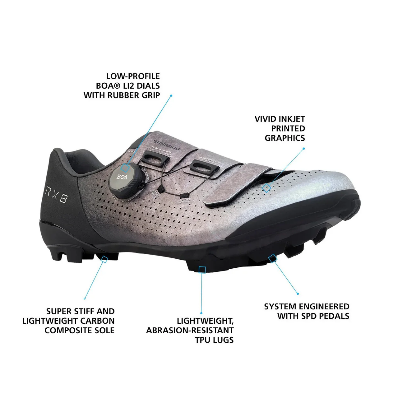 Bringing together the top performance features of our premium mountain bike and road racing footwear in a shoe that balances powerful pedaling performance and versatile off-the-bike capability, the RX801 is a featherweight all-terrain gravel shoe that's as bold as its rider. Lightweight, stiff, and walkable, it's the perfect shoe for gravel racers, gran fondo riders, and weekend warriors alike.